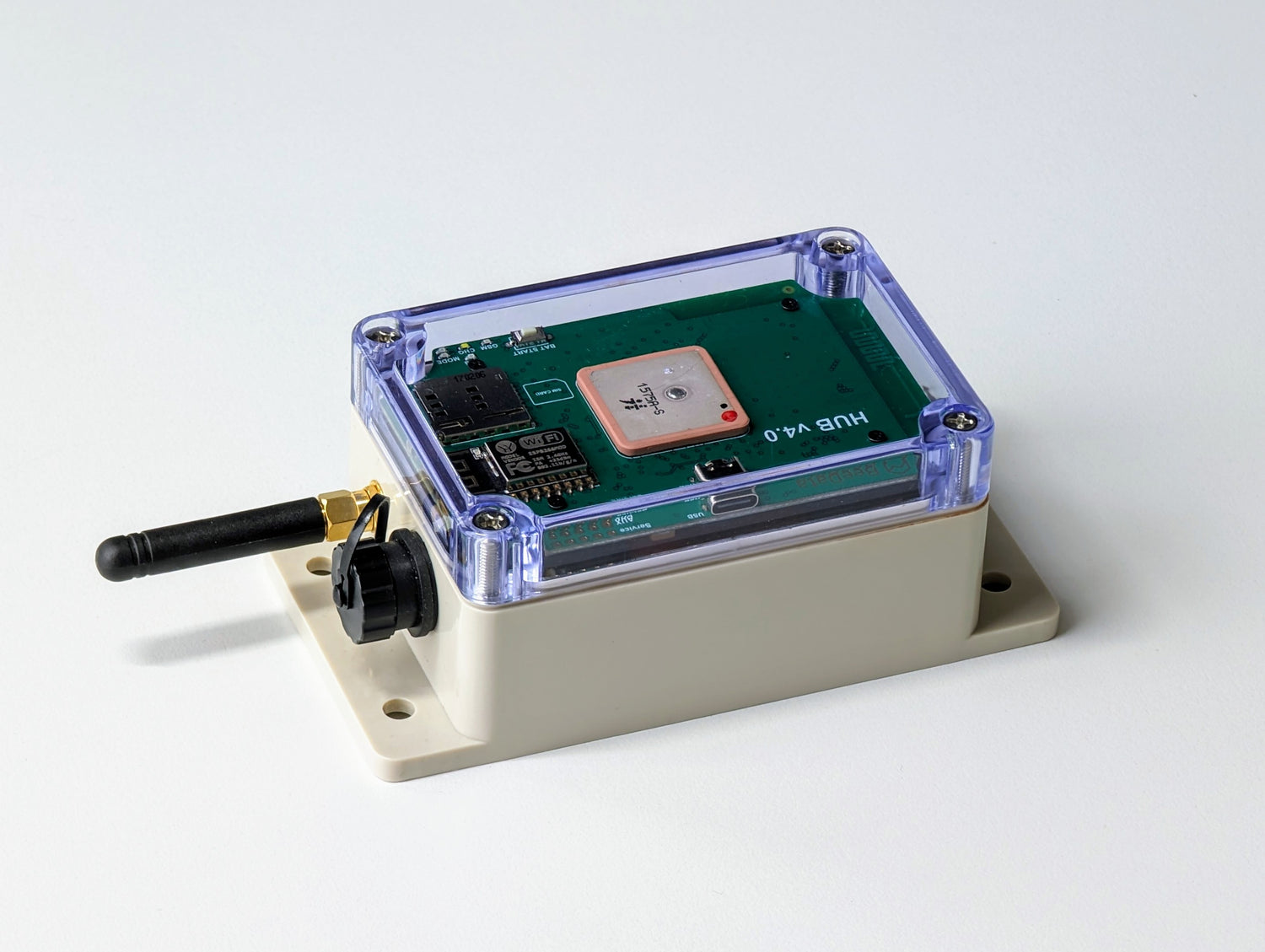 • Hub, basically being a small LoRa telecom tower, gathers data from all hives in the ~2-4 km range, and exchanges data with BeeData Cloud via Wi-Fi or GSM.