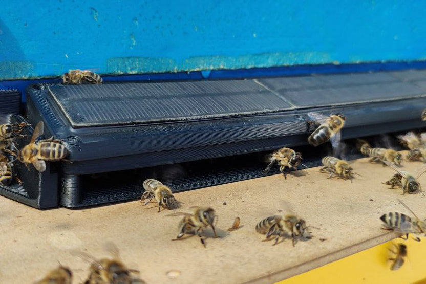 Gets installed under the hive and collects accurate weight measurements. Wirelessly sends this data to the linked Hive. Includes a physical display for checking weight on the spot.